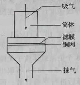 過濾式空氣采樣器是最常用、最簡單的空氣采樣器。過濾式采樣器有采樣頭、濾器、流量計和抽氣泵組成。過濾式采樣器的結構如圖: