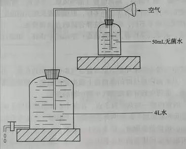 打開圖中大瓶的龍頭,空氣就被抽入無菌水中。待4L水流完,就有4L空氣通過小瓶中的無菌水,也就是4L空氣中的微生物被留存在50mL無菌水中。無菌吸取1mL過濾的水樣進行平板計數,做2個平行。37℃培養48h計數。