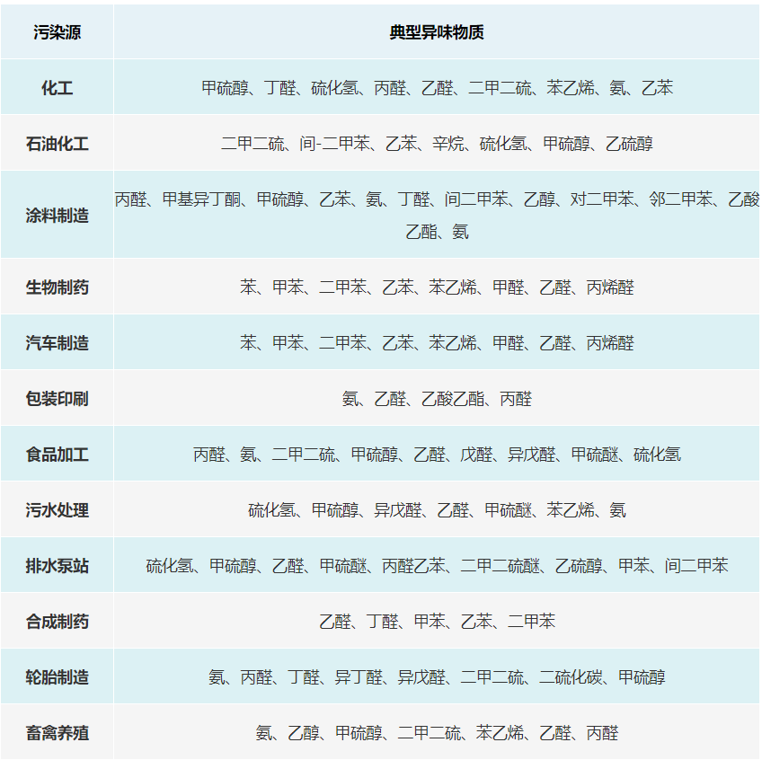 通常工業生產所產生的惡臭物質較為集中,影響較大,典型污染源的主要異味物質如下所示。
